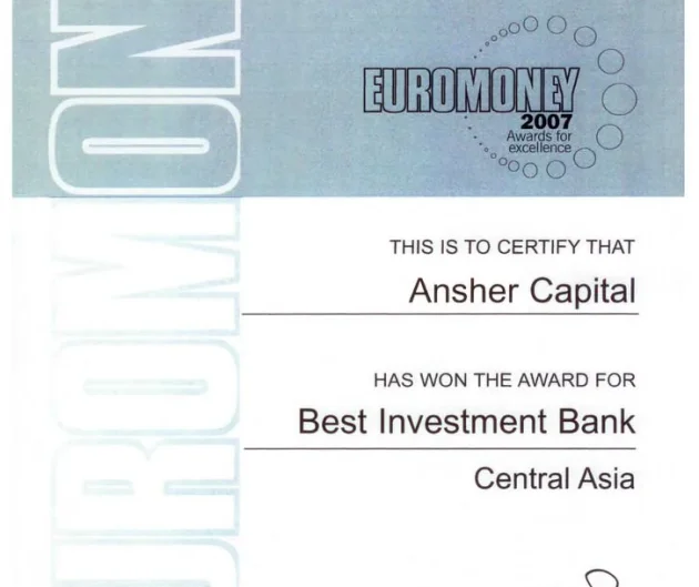Euromoney's Awards for Excellence - one of the most prestigious awards in the global banking industry. In 2007 ANSHER CAPITAL HAS WON THE AWARD FOR BEST INVESTMENT BANK- CENTRAL ASIA.